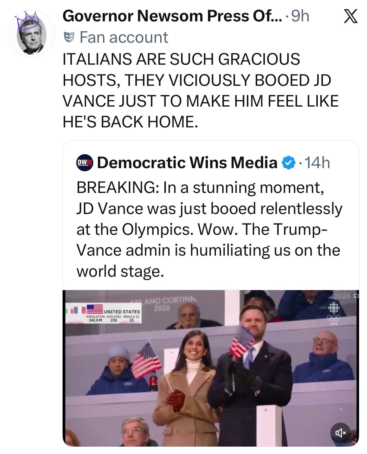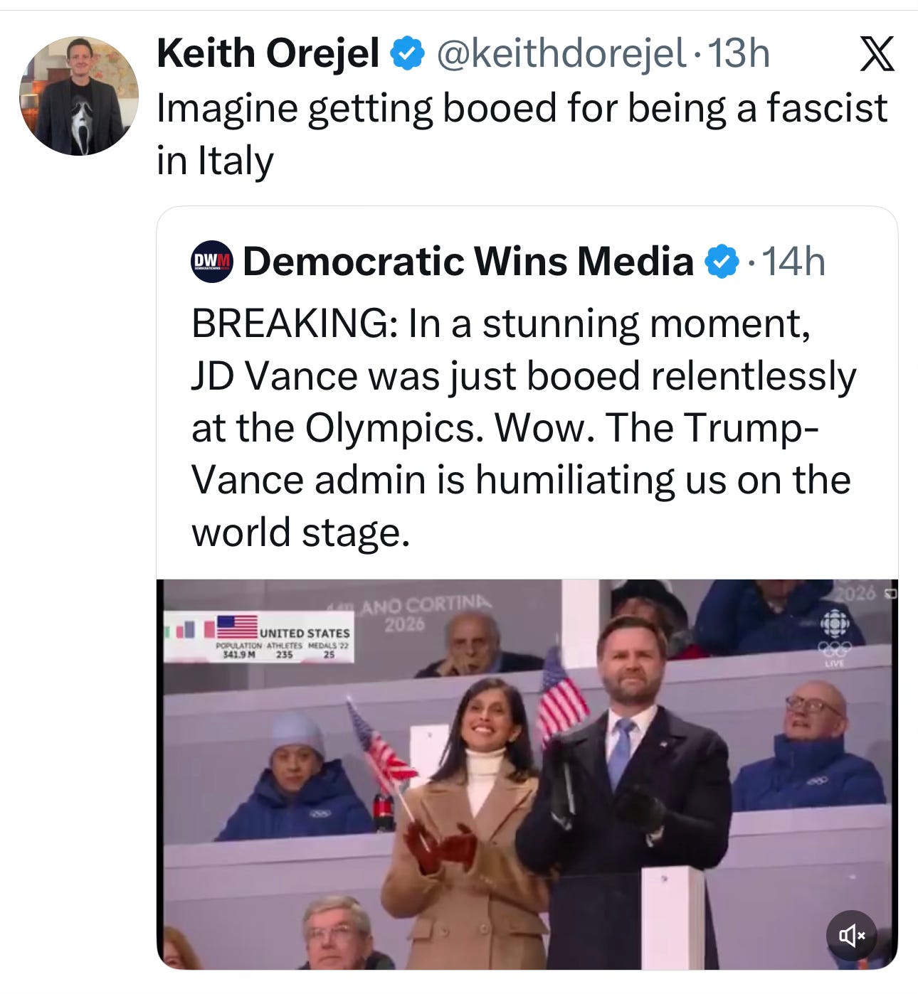 The White House has managed to destroy goodwill for the U.S. all across the world, and while NBC didn’t show this humiliating moment for JD Vance at the Olympic Opening Ceremonies, others captured it. Sound up.