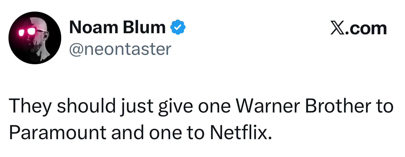 But last week, the dam broke: Warners' board indicated they'd take Paramount's offer, and Netflix withdrew their offer, and so that's that, right? It's not like Trump's FTC is going to actually block this radioactively illegal merger, despite the catastrophic corporate consolidation that would result, with terrible consequences for workers, audiences, theaters, cable operators and the entire supply chain.
