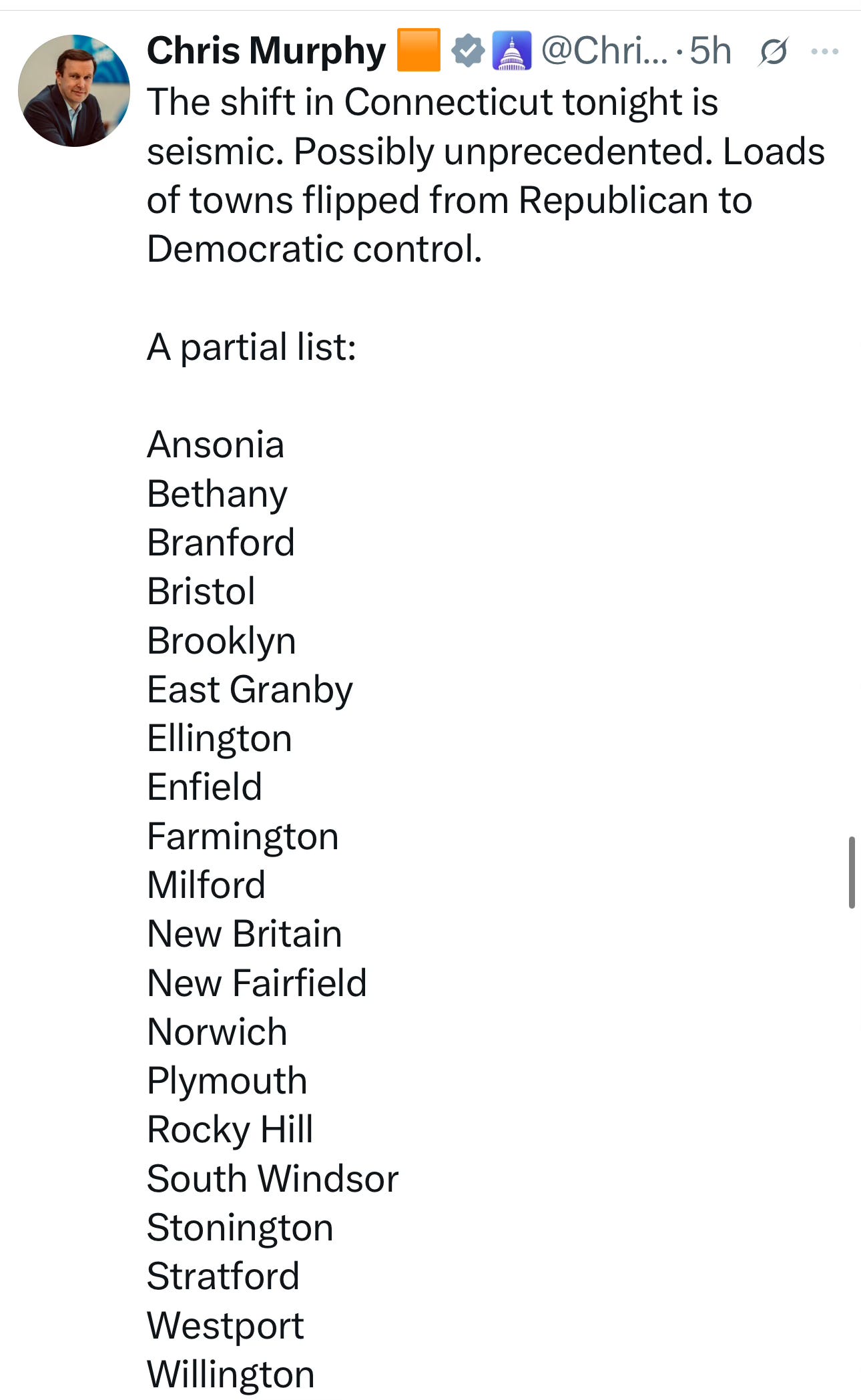 Take a look at Connecticut, too, which no one was really talking much about because it’s a blue state, right? Well, it’s still got a lot of towns, and the GOP had held power in many of them. But they got their clocks cleaned. Here’s a list from Sen. Chris Murphy (D-CT):