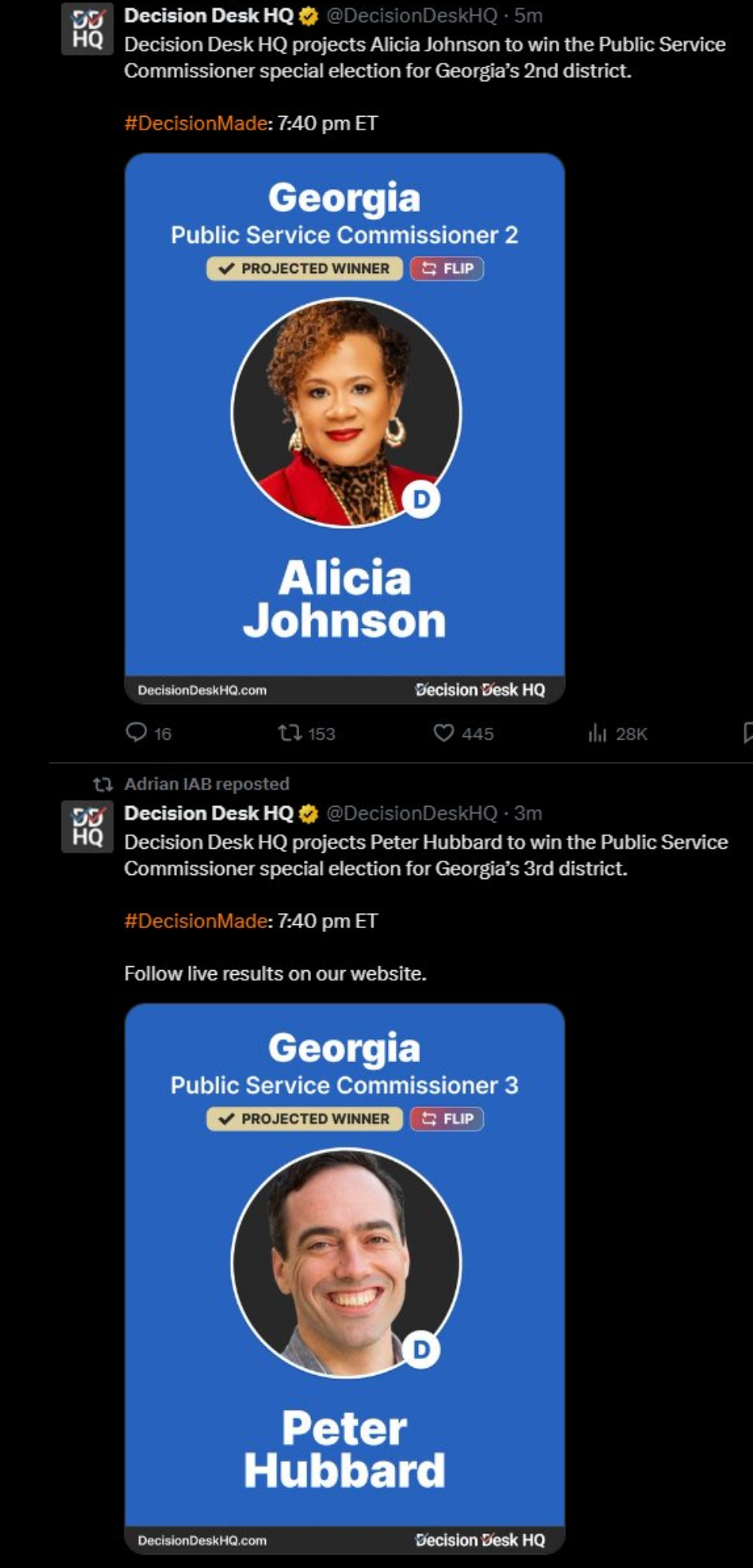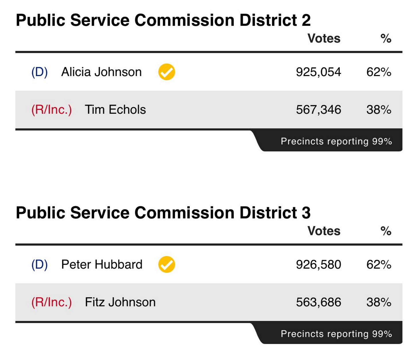 These weren’t just wins. They were blowouts that flipped two red seats on the Commission. If you’re Sen. Jon Ossoff, you’ve got to be liking these results.
