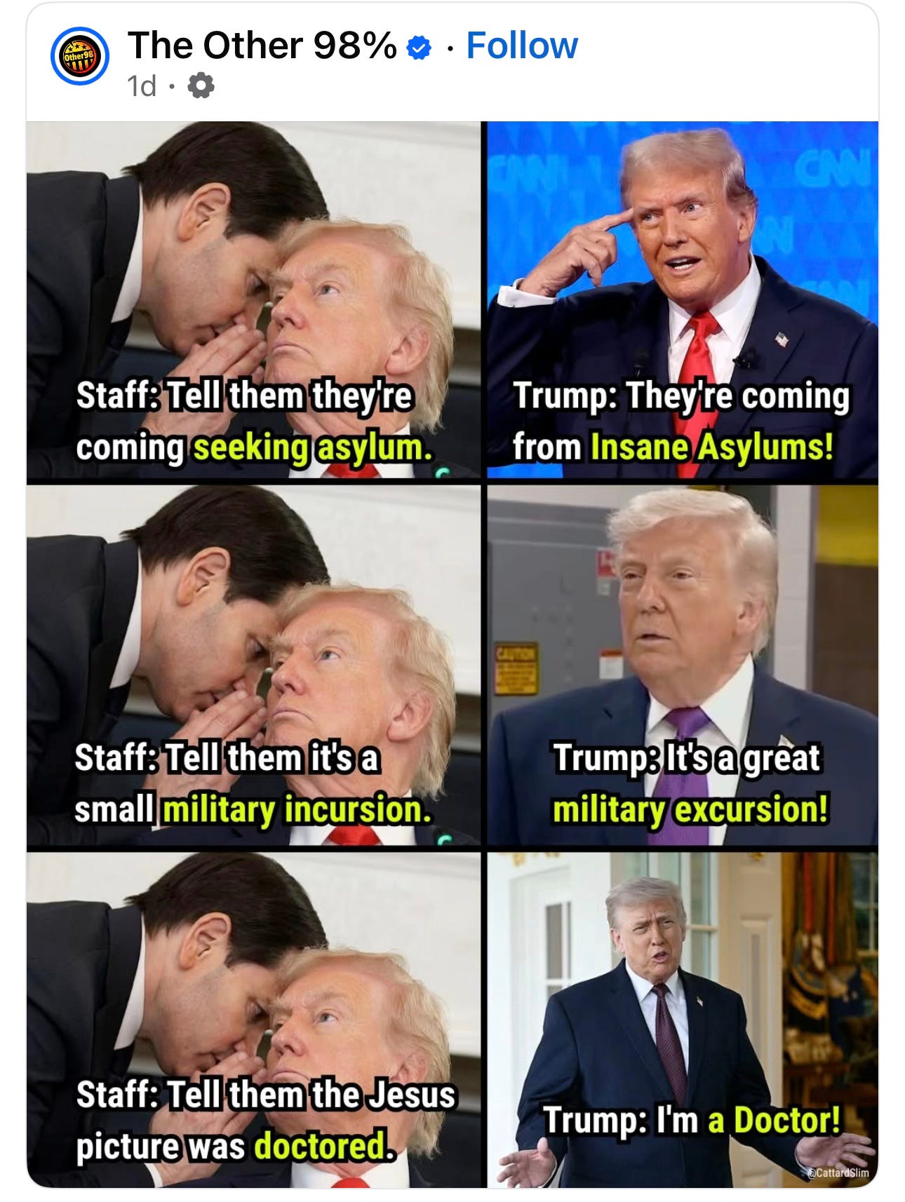 In hopes of replacing the browner people he’s actively displacing in his War on Migrants, Trump reached out to the supposedly persecuted white people of South Africa, which has only recently made steps towards treating Black people like human beings, rather than possessions or low-level subordinates. Having seen some out-of-context viral video, Trump was convinced white South Africans were being oppressed by Black South Africans, much in the same way he became convinced Haitian refugees were eating people’s pets and/or local water fowl.