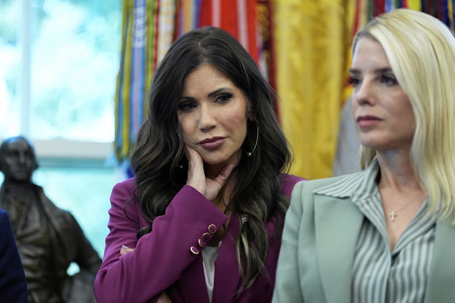 Noem got the ax because her optics were terrible and for committing the unforgivable sin of saying Trump signed off on her corrupt self-dealing. Bondi is out as of yesterday after failing to deliver criminal prosecutions of Trump’s political foes and has, in Trump’s mind, badly mishandling the Epstein files.