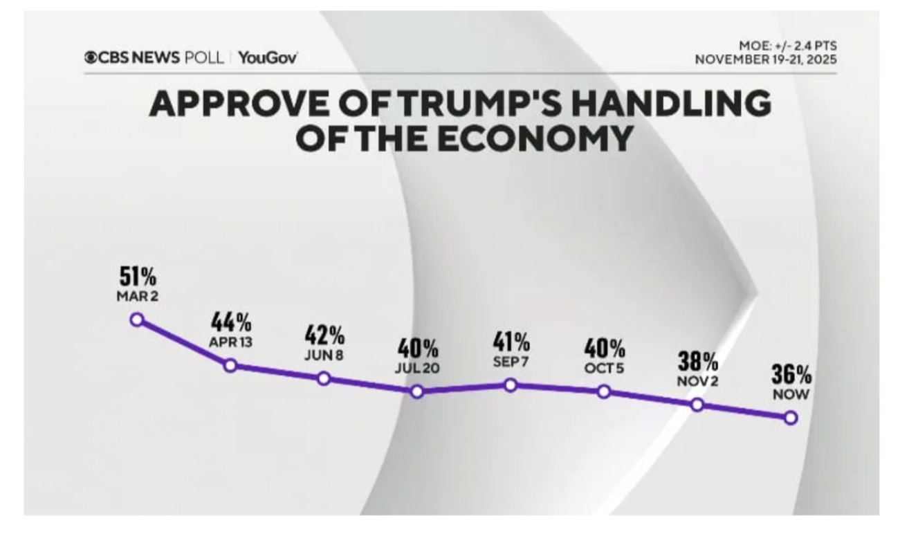Despite his best efforts to portray the economy as in a new “Golden Era,” it turns out the laws of political gravity apply to large bodies like Trump, too. And his approval numbers are in freefall over his mishandling of the economy. The latest CBS News/YouGov poll, released just days ago, has him at a new low on the issue, with just 36 percent approving.