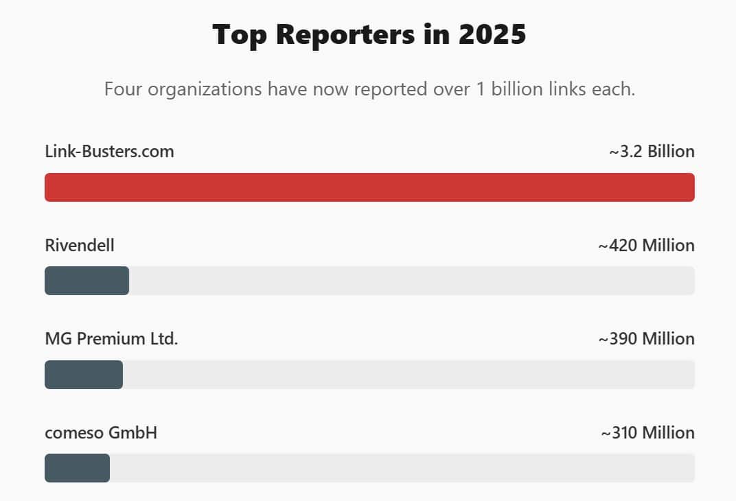 In 2025 alone, Link-Busters was good for more than 3.2 billion reported URLs, which dwarfs all other senders. Rivendell is the runner-up with roughly 420 million reported links, followed by MG Premium, the copyright enforcement arm of Pornhub parent company Aylo, which requested 390 million removals.
